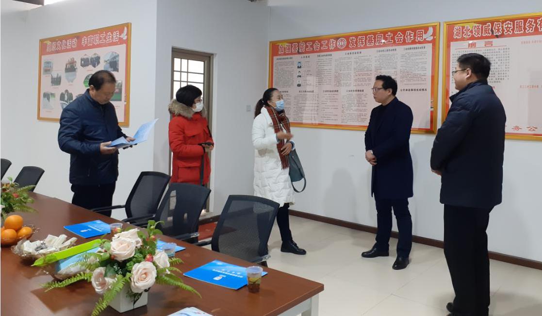2020年12月16日,掇刀區(qū)總工會(huì)副主席王愛玲、區(qū)水利和湖泊局黨組書記、局長(zhǎng)劉登峰、掇刀石街道黨委組織委員周璇、掇刀石街道工會(huì)聯(lián)合會(huì)副主席劉太國(guó)等一行4人蒞臨領(lǐng)威保安服務(wù)有限公司調(diào)研指導(dǎo)工作,公司總經(jīng)理劉道軍、運(yùn)營(yíng)總監(jiān)郭旭陪同調(diào)研。