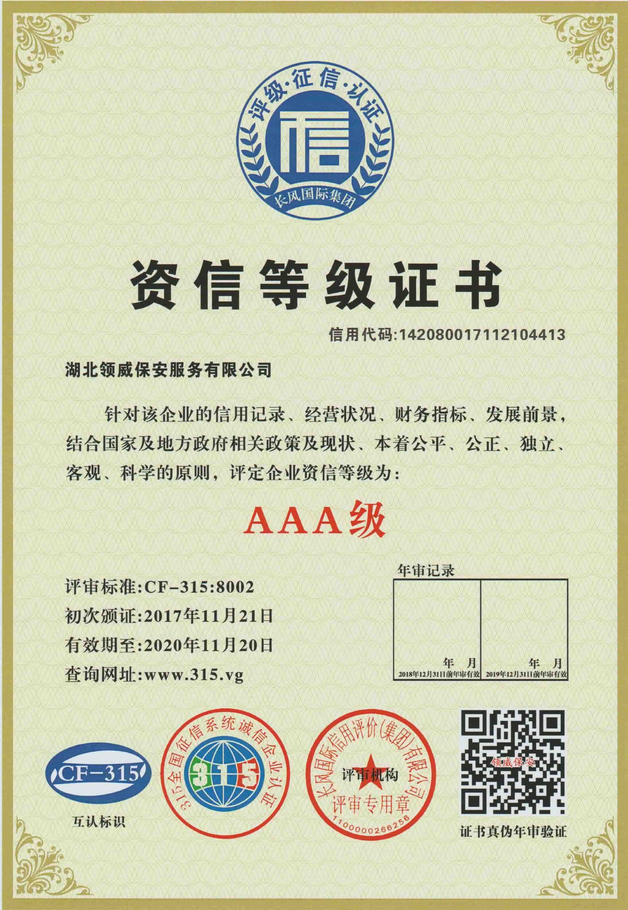 11月21日,湖北領(lǐng)威保安服務(wù)有限公司一次性順利通過了國家3A級信用等級、國家3A重合同守信用企業(yè)、國家3A級質(zhì)量服務(wù)信譽企業(yè)、國家3A級資信等級、國家3A級誠信經(jīng)營示范單位共5項企業(yè)認(rèn)證。